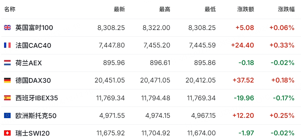 欧洲主要指数多数上涨,英国富时100涨0.06%,法国CAC40涨0.33%,德国DAX30涨0.18%。