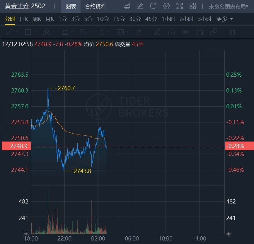 黄金期货小幅走低,现跌0.28%,报2748.9美元/盎司。