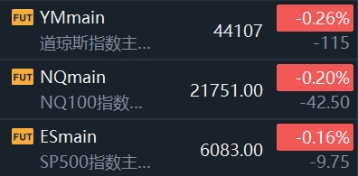 美股三大股指期货集体走低,截至发稿,道指期货跌0.26%,纳斯达克100指数期货跌0.2%,标普500指数期货跌0.16%。