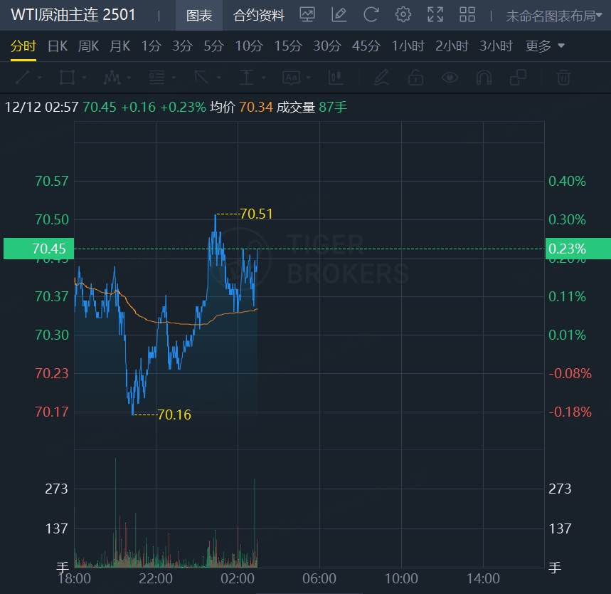 原油期货震荡走高,WTI原油报70.45美元/桶,涨0.23%;布油现报73.76美元/桶,涨0.33%。