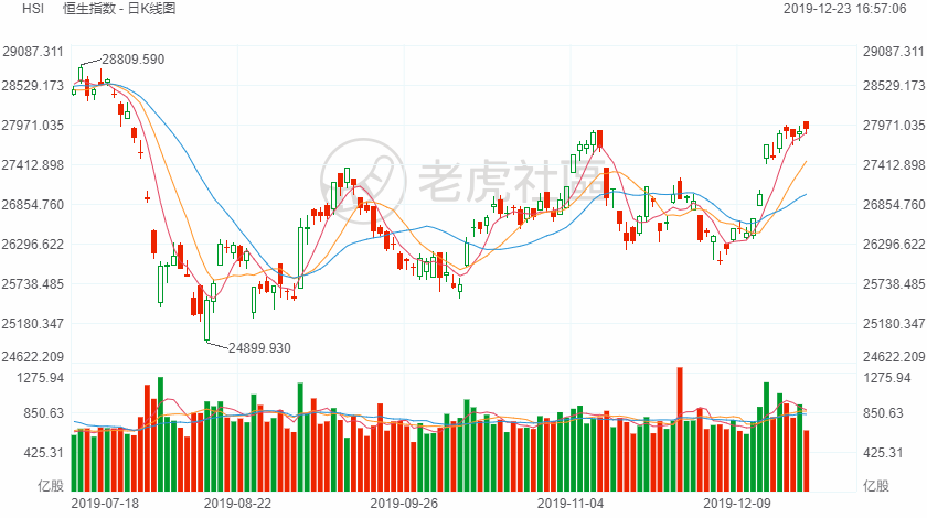 12月23日,恒生指数开盘涨153.27点或0.55%,全天震荡下跌,市场情绪低迷。截至收盘,恒生指数涨35.06点或0.13%,报27906.41点,全日成交额655.51亿。国企指数涨0.2%,报11052.68点,红筹指数涨0.17%,报4451.08点。