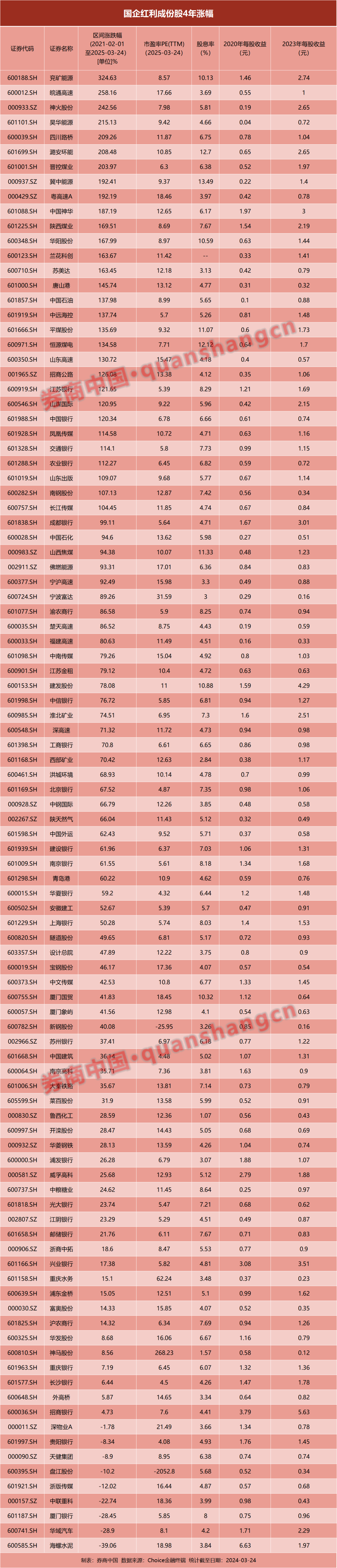 以国企红利成份股为例,三成个股走出了翻倍行情,除了能源股以外,港口、高速、出版、建筑装饰等行业均有个股在过去4年中涨幅超过1倍。