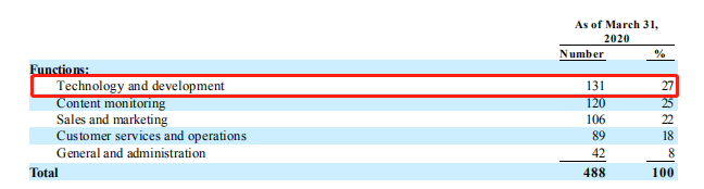 招股书显示,2019年全年公司技术研发费用达1.3亿元,同比增长38%,研发费率高达17%左右,这一研发强度在国内互联网界都非常突出。以2019年工信部公布的互联网百强企业为例,总的平均研发强度在10%以上,仅20家成长性企业平均研发强度在16.2%。这也体现出了公司尚处在成长期。另外,截至到2020年Q1期末,蓝城兄弟的技术研发成员占比最高,达27%。