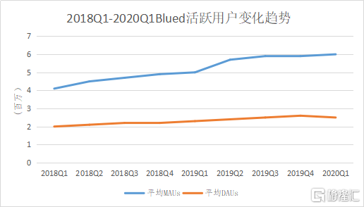 2018年Q1至2020年Q1,不论是月活还是日活,Blued都在持续上涨。同时,活跃用户在2019年的日均停留时长超过60分钟,平均每日打开次数超16次,次月留存率达71.0%。