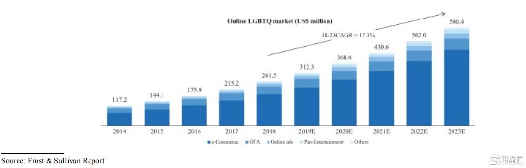 Blued所切入的利基市场有着万亿美金级别的消费潜力,而且随着群体的持续扩大及在线消费的渗透,市场还将不断扩容,也意味着空间被持续打开。