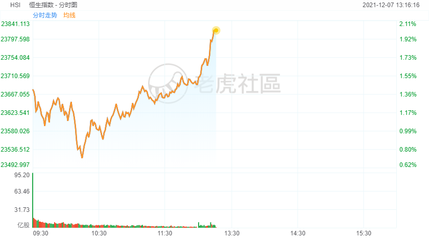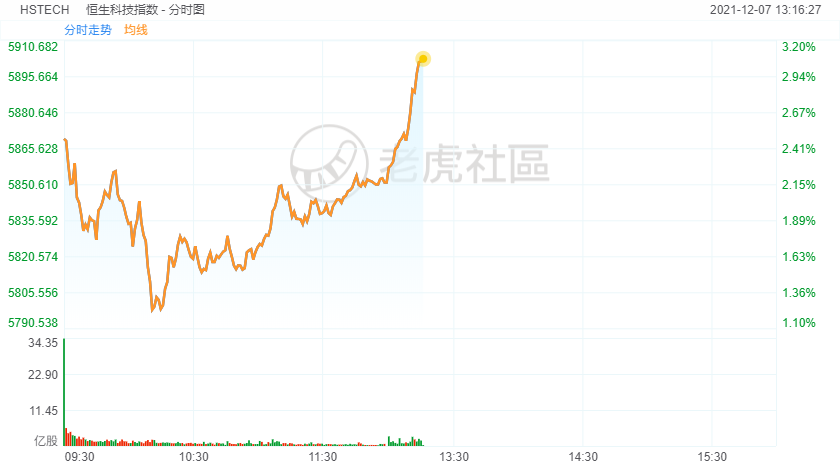 12月7日,恒指午后涨幅扩大至2%,恒生科技指数涨幅扩大至3%,科技、地产股领涨,阿里巴巴-SW涨超10%领涨蓝筹;中国奥园涨超14%,融创中国涨超13%。
