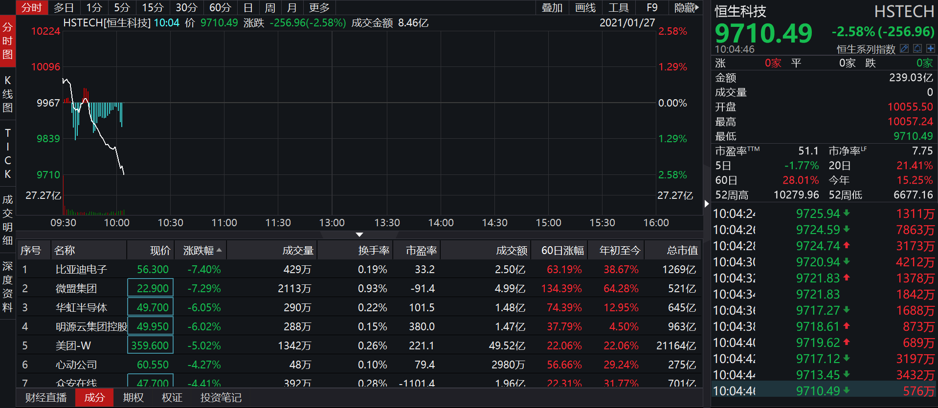 1月27日,恒生科技指数持续走低,跌幅扩大至2%,半导体、SaaS板块跌幅居前。