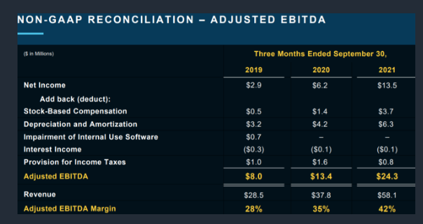 2021年第四季度,我们预计收入将在7400万至7600万美元之间,比2020年第四季度增长32%至35%。我们预期经调整EBITDA将介于2,800万美元至3,000万美元之间,约有40%的利润率。