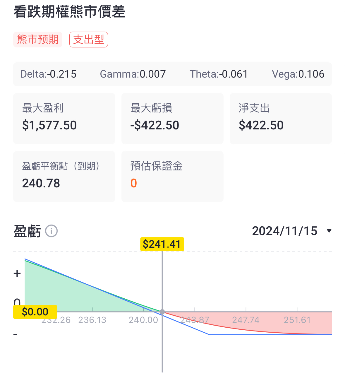 这笔价差期权交易的成本是4.225美元,或每手422.5美元。$SMH 跨價 241115 225P/245P$