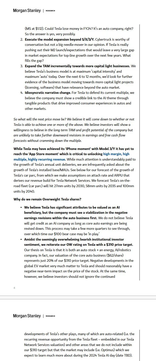 - 在机构投资者看跌特斯拉的情绪似乎压倒一切的情况下,我们重申对特斯拉的“超配”评级,目标价为310美元。我们对特斯拉的看法是,它既是一支汽车股票,也是一家能源、AI/机器人公司。事实上,我们对核心汽车业务的估值(62美元/股)仅占我们310美元目标价的20%。全球电动汽车市场的负面发展对特斯拉影响非常大,理应在短期内对股价产生负面影响。但与此同时,我们认为投资者也不应忽视特斯拉其他业务的持续发展,其中许多都与汽车有关(如特斯拉车队的经常性收入机会——包含在我们对特斯拉网络服务的估值中),还有其他一些我们没有纳入310美元目标价,但市场可能会纳入的领域(如Optimus),我们希望在2024年特斯拉Al Day(日期待定)上能了解到更多信息。