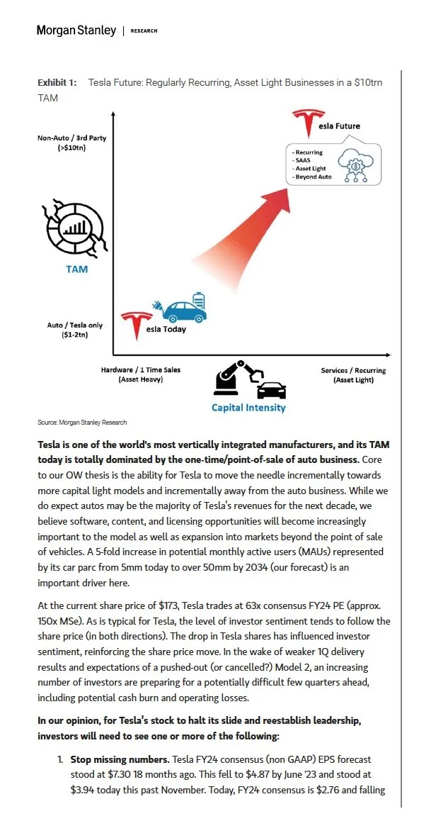 4. 改变不合常理的叙事。我们认为,特斯拉要想捍卫当前的市盈率倍数,就必须通过实实在在的产品,推动汽车和其他市场消费者体验的改善,从而展示出与Al主题的可靠联系。