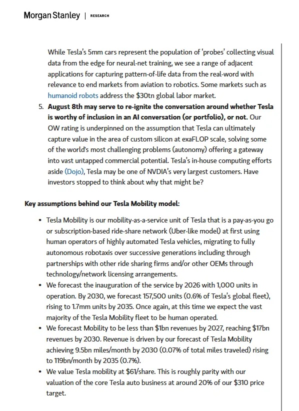 - 我们对特斯拉出行的估值为每股61美元。这与我们对特斯拉核心汽车业务的估值基本持平,约为我们310美元目标价的20%。
