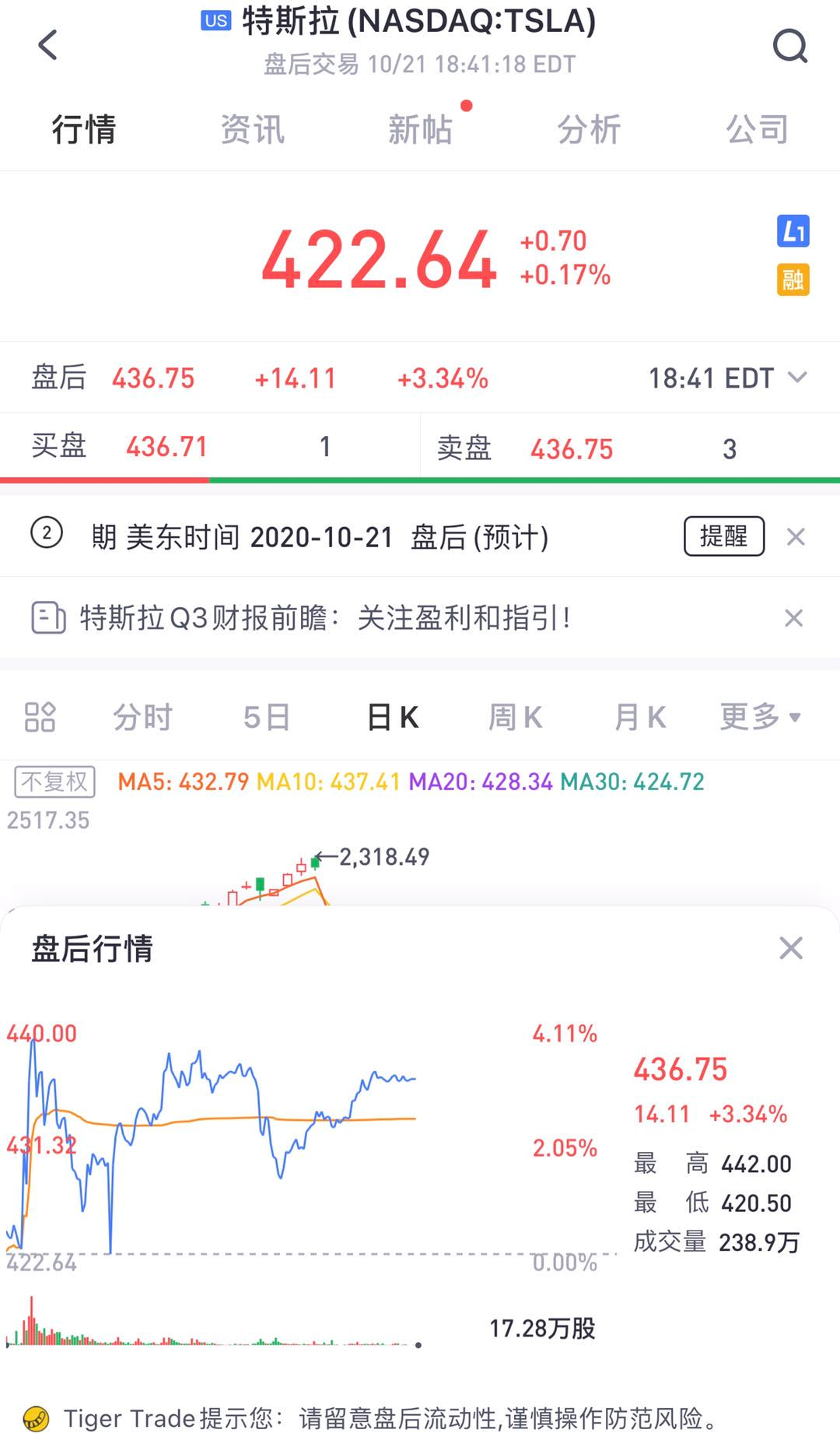 受到财报数据和产能预期带动,截至发稿,特斯拉盘后上涨3.34%,报436.75美元。