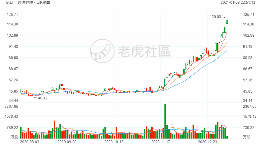 1月8日美股盘初,哔哩哔哩续刷历史新高,截至发稿,哔哩哔哩涨6.72%,盘中最高报120.03美元,总市值超400亿美元。