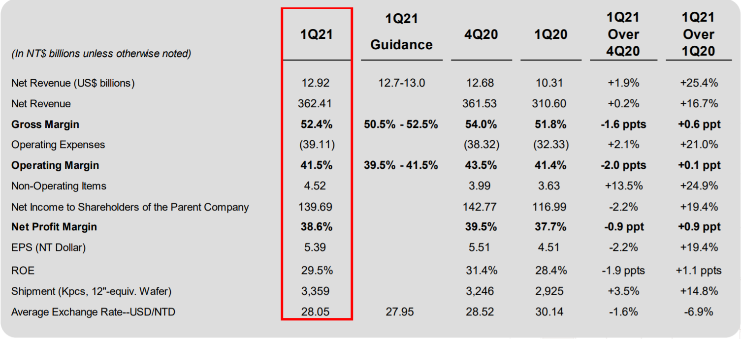 4月15日,台积电发布2021年第一季度业绩。财报显示: