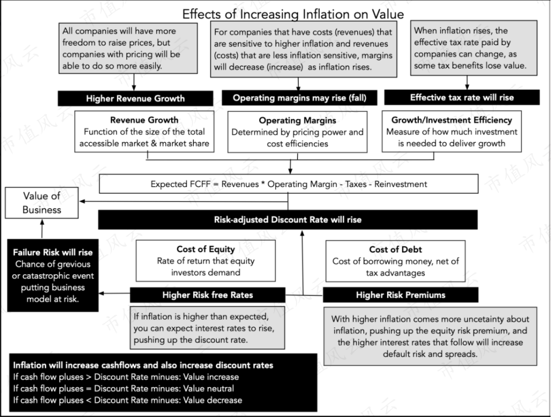 为了理解通货膨胀如何影响股票价值,请看如下的企业价值的驱动因素图。