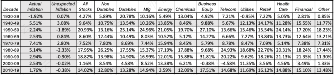 唯一似乎与通胀有关的行业是能源,它不仅在1970年代随着油价飙升而表现出色,而且在另一个高通胀十年1940年代也表现出色,但在2010年至2019年期间表现不佳,因为通胀降至历史水平低点。