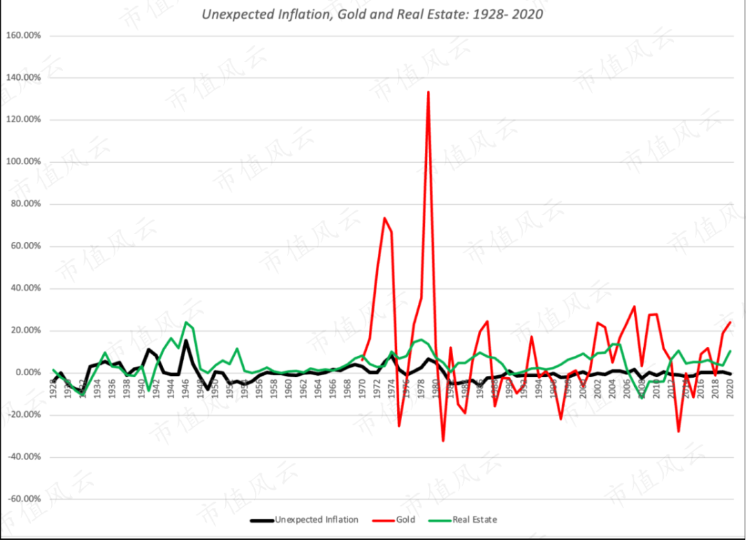 仅有的两种同时随预期通胀和意外通胀而变动的资产类别都是黄金和房地产,尽管这种联动的相当一部分可以用1970年代来解释。虽然房地产是一种更好的对冲预期通胀的工具,但黄金在抵御意外通胀方面做得更好。