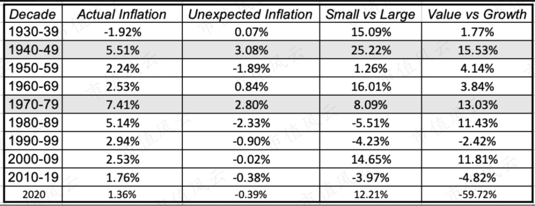 此表中的数据存在过度解读的风险,但低PB股票最好的30年是1940-49、1970-79和1980-89,这30年通胀率很高,其中20年通胀率远远高于预期。
