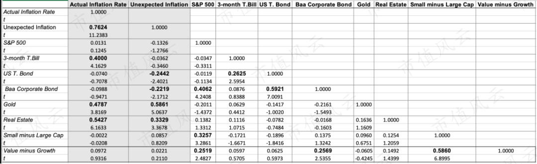 股票和预期通胀几乎不相关,但股票与意外通胀的相关性为负,尽管比债券表现出的弱且在统计上不显著。