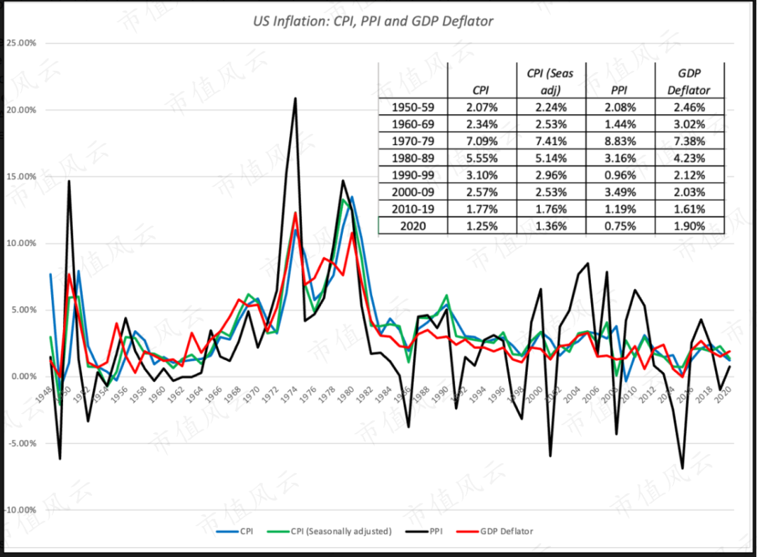 通货膨胀最高是在在1970年代,并蔓延到1980年代的头几年,那是美国最接近面临通胀失控的时刻,后面我们将研究这一时期的投资表现。