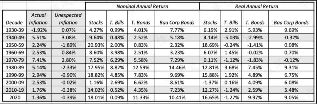 然而,真理来源于数据,在本节中,我将回顾近100年的历史,看看不同资产类别在应对预期通胀和意外通胀时的实际表现。