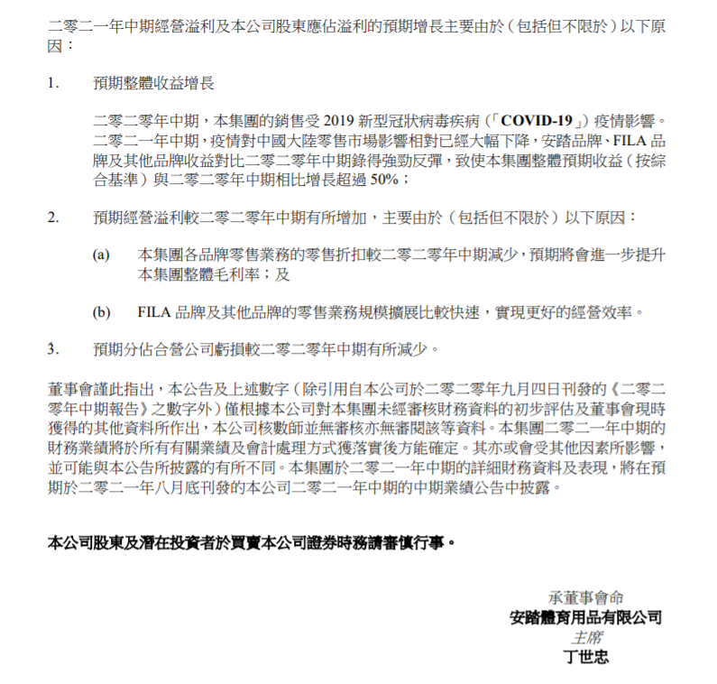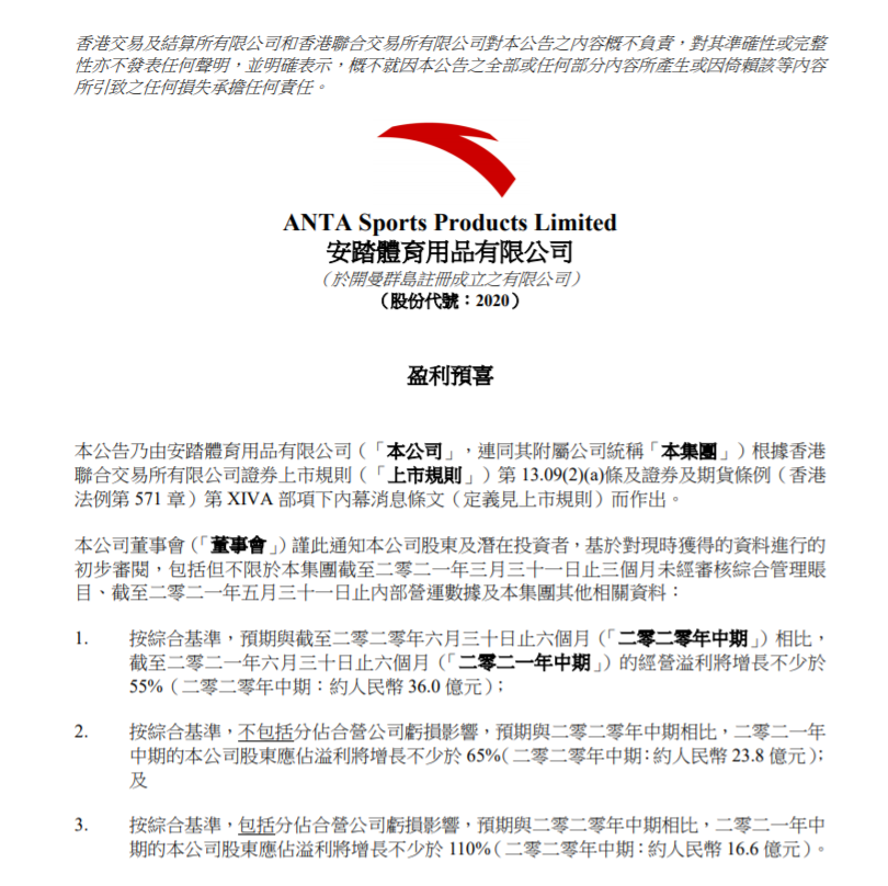 安踏体育:预计上半年股东应占溢利将增长不少于65%