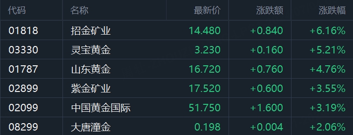 7月4日,港股黄金股走高,招金矿业涨超6%,灵宝黄金涨超5%,山东黄金涨超4%
