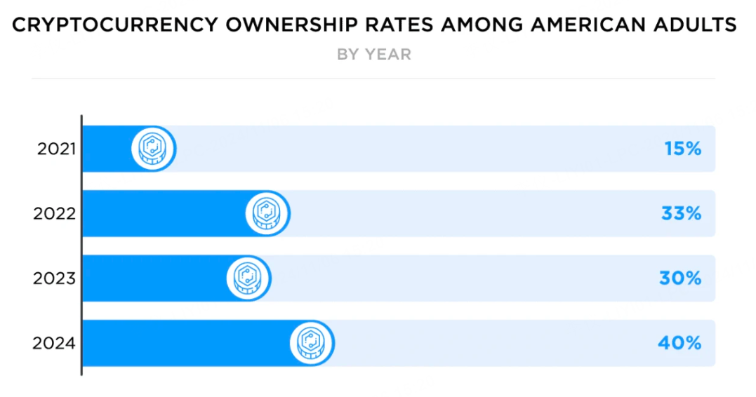加密货币认知度和拥有率已升至创纪录水平:目前 40% 的美国成年人拥有加密货币,高于 2023 年的 30% ,这一数字可能多达 9300 万人。