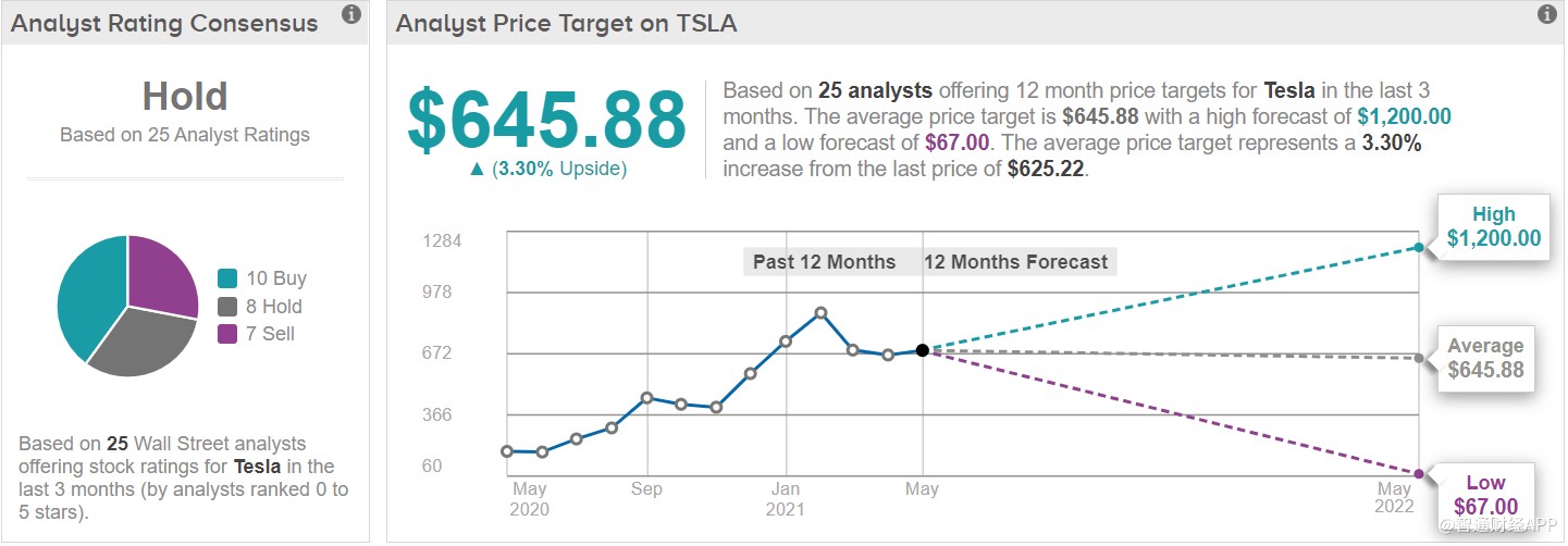过去三个月,有10位华尔街分析师予特斯拉“买入”评级,8位予“持有”评级,7位予“卖出”评级,共识评级为“持有”,平均目标价为645.88美元,这意味着上行空间仅为3.3%。