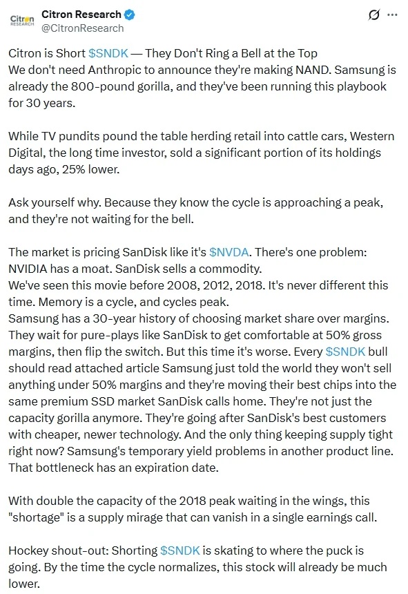 知名做空机构香橼称正在做空 闪迪 ,指当前存储芯片市场繁荣为“供应幻象”。香橼续称,市场正按照英伟达的逻辑给闪迪定价,但这存在一个致命问题:英伟达拥有护城河,而闪迪销售的仅仅是大宗商品。存储芯片本质上是周期性行业,而周期终会见顶。闪迪盘中震荡下挫,截至发稿跌幅超5%。同时, 希捷科技 跌近3%, 西部数据 跌2%, 美光科技 跌约1%。