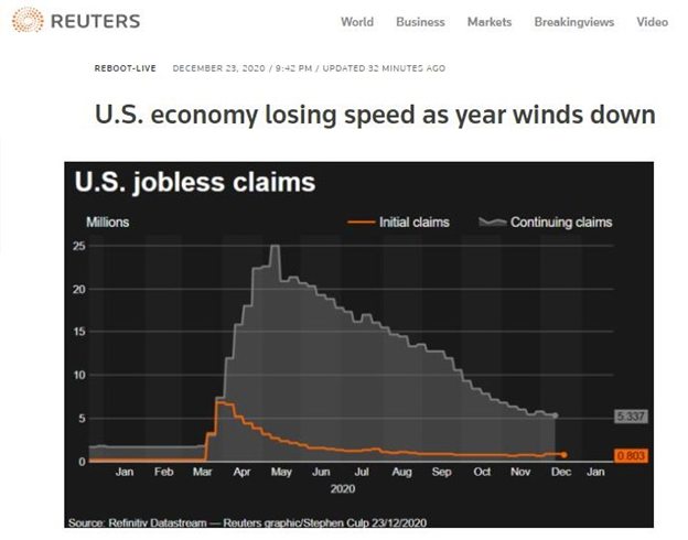临近年末美国经济失去增长势头 本周三美国劳工部公布,季节性调整后,上周美国首次申请失业救济人数较上上周减少8.9万,降至80.3万,低于经济学家预期的88.5万,但仍远超疫情爆发前的水平。在今年3月申请人数达到686.7万创历史新高以前,史上最高水平是2007年到2009年经济衰退期的66.5万。 申请失业救济人数高企源于,新冠肺炎病例再度高涨让更多的企业面临防疫限制,也打击了消费者。 FHN Financial的首席经济学家Chris Low评论称,11月美国经济失去了增长的动力。 同在周三,美国公布的11月新屋销售年化户数84.1万户,创6月以来的五个月新低,环比下降2.1%,市场预期降幅仅0.3%。11月美国消费者的个人收入和支出降幅均超过预期,收入环比下降1.1%,支出下降0.4%,4月以来首次下滑。
