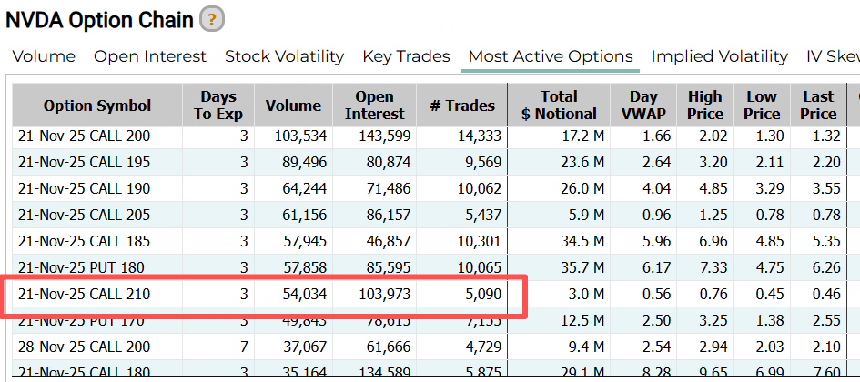 具体来看,英伟达昨日成交量排名前五的合约都是CALL。此外,一份同样排名前十的认购合约,本周五到期,行权价达210美元,较现价有15%的涨幅空间。