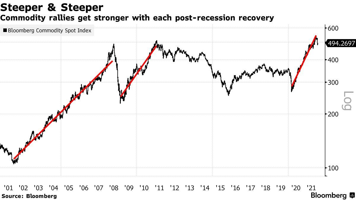 下图显示了自2000年以来彭博商品指数的对数标度,衡量移动速度的回归线显示了新冠疫情后的复苏与本世纪的其他两次复苏有何不同。