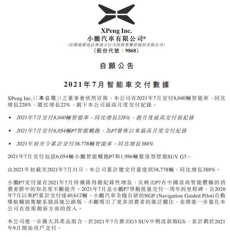 8月2日讯,小鹏汽车在港交所公告,2021年7月交付8,040辆智能车,同比增长228%,环比增长22%,创下公司最高月度交付纪录;今年截至7月31日,公司累计总交付量达到38,778辆,同比增长388%;公司计划于2021年第三季度正式发布P5,预计在2021年第四季度交付。【公告】
