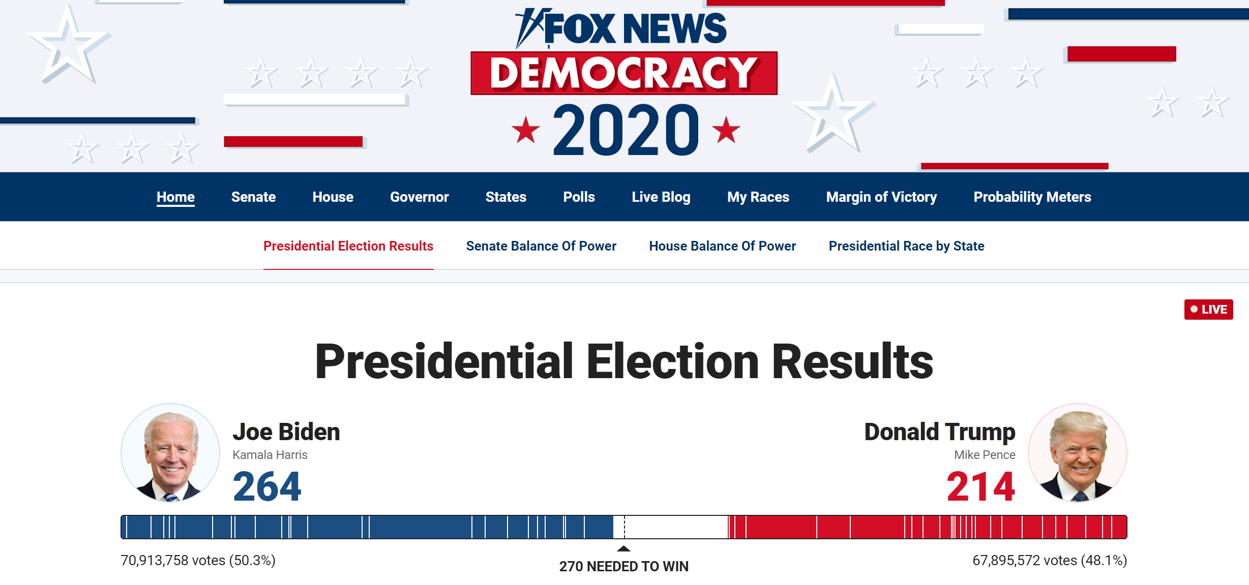 截至发稿,拜登已获得264张选举人票,特朗普则获得214张选举人票。