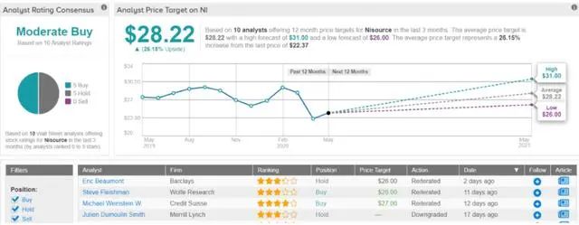 分析师对NI的共识评级为温和买入,5名分析师给予买入,5名分析师给予持有。该公司股票的平均目标价为28.22美元,较当前22.37美元的股价有26%的溢价。