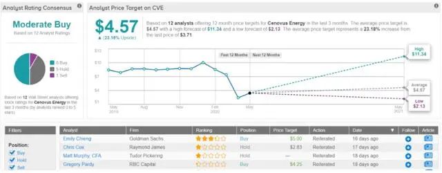 分析师们对这支股票的看法有些分歧;在最近的12篇评论中,有6篇是买入,5篇是持有,1篇是卖出。市场普遍的评级是“温和买入”。平均目标价为4.57美元,与Ollenberger的目标价一致,并表明CVE在未来一年有23%的上升空间。