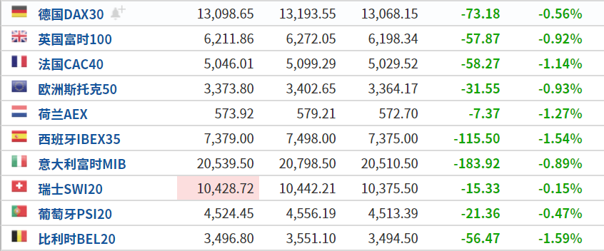欧洲股市集体下挫,截止发稿时间,英国富时100指数跌0.92%,法国CAC40指数跌1.14%,德国DAX指数跌0.56%。