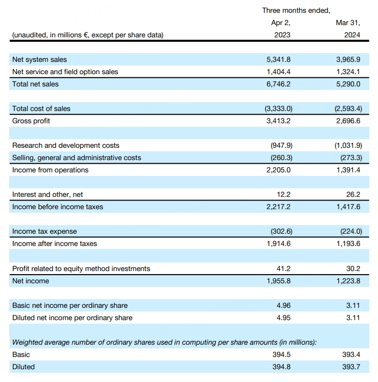 Q1新增订单金额为36.11亿欧元,其中包括6.56亿欧元的EUV订单。Q1新增订单金额不及市场预期的46.3亿欧元,且较2023年Q4创纪录的91.9亿欧元下滑近三分之二。