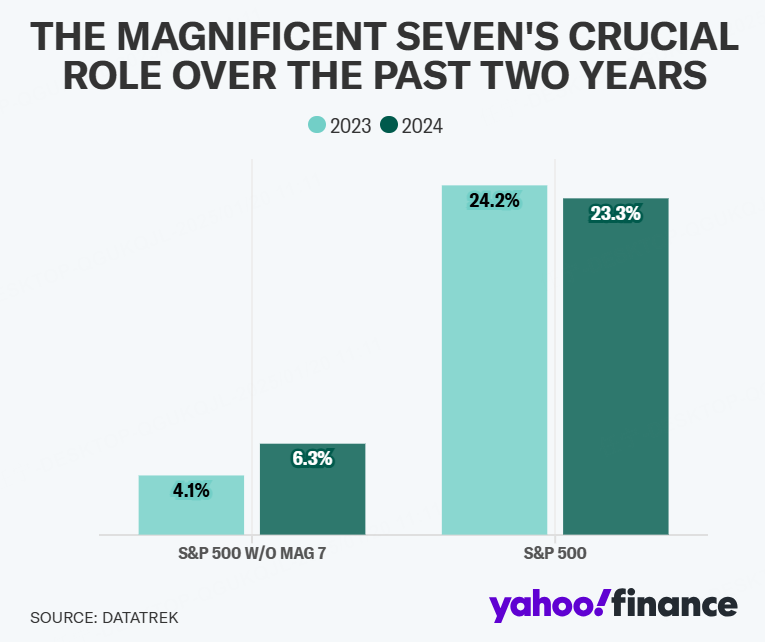 放大来看,去年的涨势大部分是由少数几家公司推动的。事实上,标普 500 指数从未如此集中,该指数中排名前十的股票占该指数的近 40%。包括“七巨头”在内的许多股票在过去两年中推动了大部分涨幅。