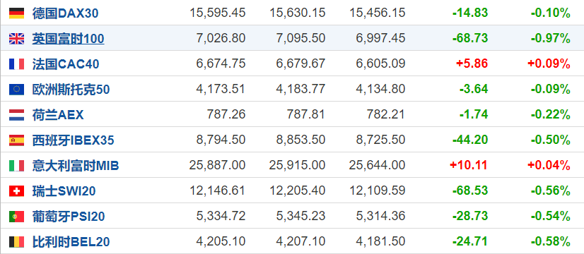 欧洲主要股指跌多涨少,截至发稿,德国DAX30指数跌0.10%,英国富时100跌0.97%、法国CAC40涨0.09%。原油