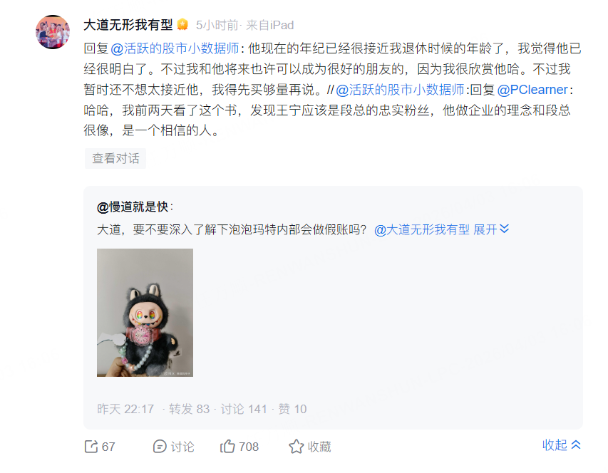 段永平在社交媒体谈泡泡玛特创始人王宁:我很欣赏他。不过我暂时还不想太接近他,我得先买够量再说。