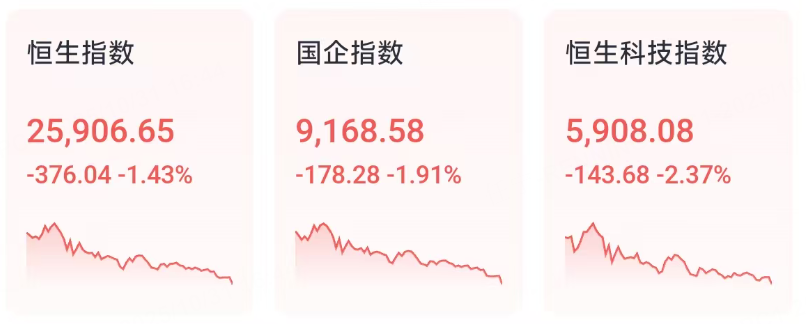 10月31日周五,港股三大指数全天震荡走低,均录得三连跌。截至收盘,恒生指数跌1.43%,再度失守26000点大关;国企指数跌1.91%,恒生科技指数大跌2.37%。