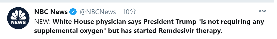 NBC刚刚消息,一名白宫医生表示,特朗普“不需要任何补充氧气的疗法”,但已经开始接受瑞德西韦治疗。