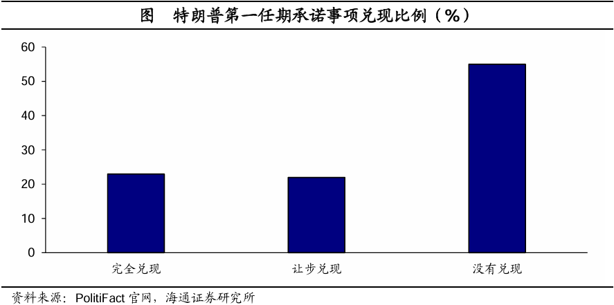 从政策兑现情况来看,特朗普第一任期兑现比例超4成。根据PolitiFact统计,特朗普在第一任期有23%的政策是完全兑现,比如不削减社会保障、提高进口到美国的商品关税、限制非法移民以及退出巴黎气候协定等等。有22%的政策是让步兑现,即有所妥协,比如取消遗产税方面,实际上只是提高了起征点,而非取消。有55%的政策没有兑现,比如投资美国基建,以及恢复美国制造业等等。