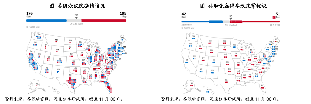 截至11月6日,美联社最新数据显示,在参议院方面,共和党领先的席位已经达到51个,也就意味着共和党赢得了参议院的掌控权。在众议院方面,共和党领先的席位有195个、民主党有176个,也就意味着共和党赢得众议院的概率也非常大。