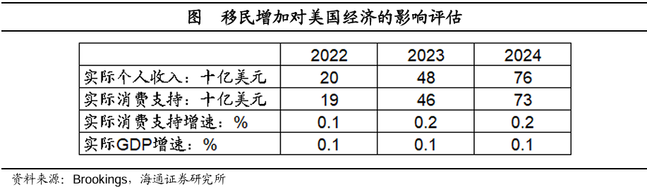 对于移民政策方面,特朗普的强硬政策一旦实施,也会增加美国经济的滞胀风险。根据温迪·埃德尔伯格和塔拉·沃森(2024)的研究发现,最近几年移民的大量流入,有效缓解了美国劳动力紧张问题,对美国消费支出和经济增长有积极的正面效用。根据测算,移民的增加将促使2023年和2024年实际消费增速上升0.2个百分点,促使实际GDP增速上升0.1个百分点。