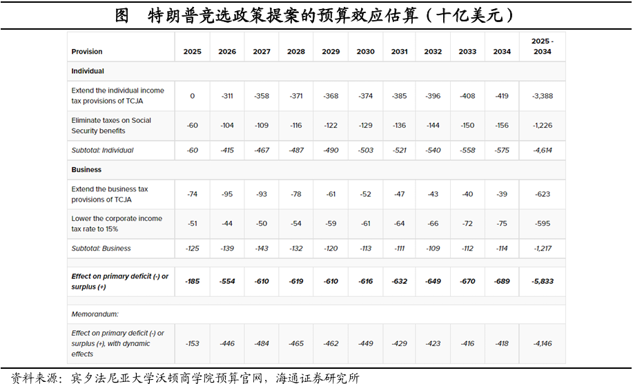 对于税收政策方面,特朗普可能带来新一轮财政扩张。根据测算,特朗普团队的税收和支出提案,一方面,将在未来10年增加美国基本赤字5.8万亿美元;如果考虑经济反馈的动态效应,则最终赤字将增加4.1万亿美元。