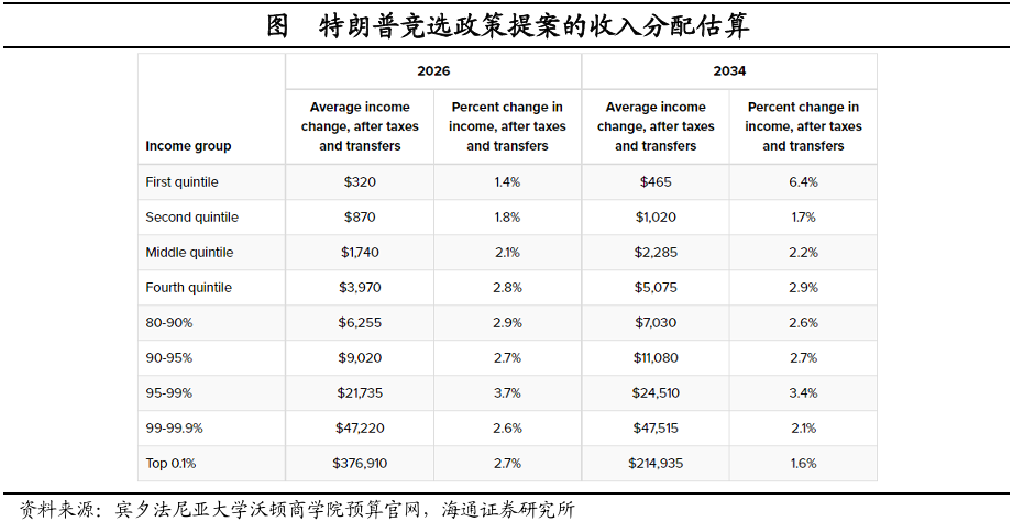 此外,特朗普的财税政策主张将使得不少群体受益,其中,收入增幅最大的是收入在前95-99%的家庭,到2026年其收入将增加3.7%;而收入最低的两个阶层,也将增加1.4%和1.8%,增幅相对不及中高收入群体。